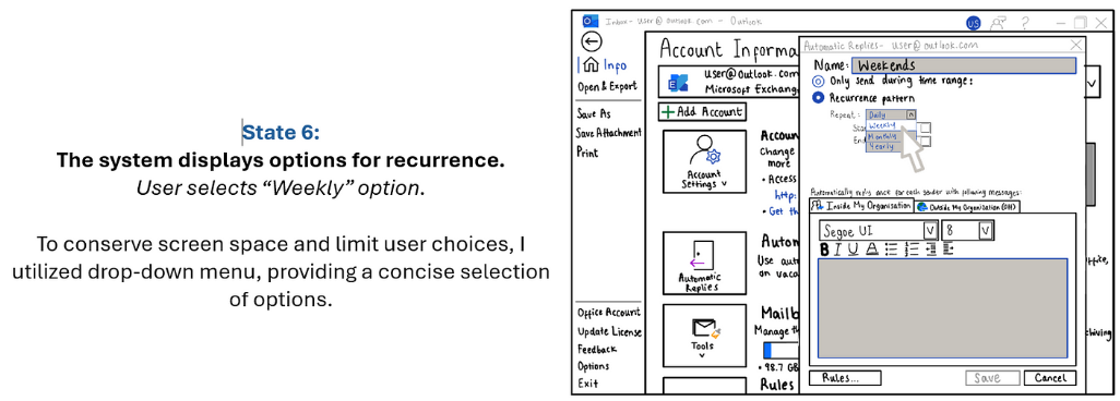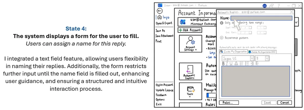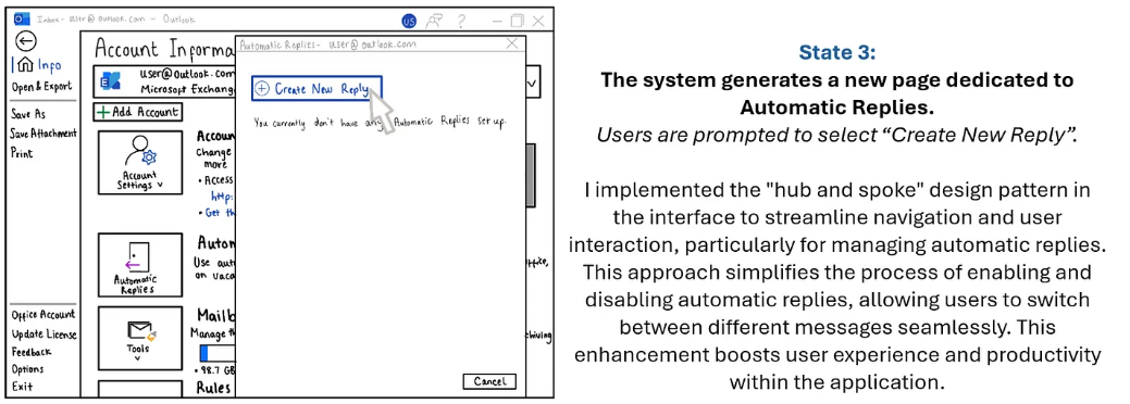 Additionally, I employed two key design patterns, Progressive Disclosure and Wizards/Tunnels, to enhance usability and user experience. Progressive Disclosure gradually reveals information, minimizing cognitive overload and promoting comprehension. Wizards and Tunnels structure the setup of automatic replies into clear steps, simplifying complex processes and fostering user engagement. Together, these design strategies elevate user satisfaction and streamline the overall user experience.