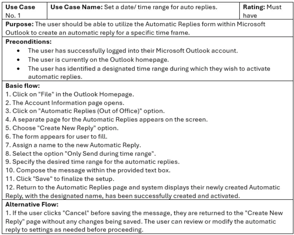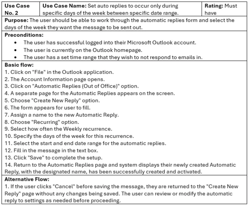 This project focuses on improving the functionality of Microsoft Outlook's Automatic Replies feature. Currently, users can only establish a continuous time frame for replies, limiting customization options. The objective is to redesign the interface, enabling users to set replies for specific dates, days of the week, and working hours. By providing users with greater flexibility in managing automatic replies, the project aims to enhance user experience and productivity within the application.