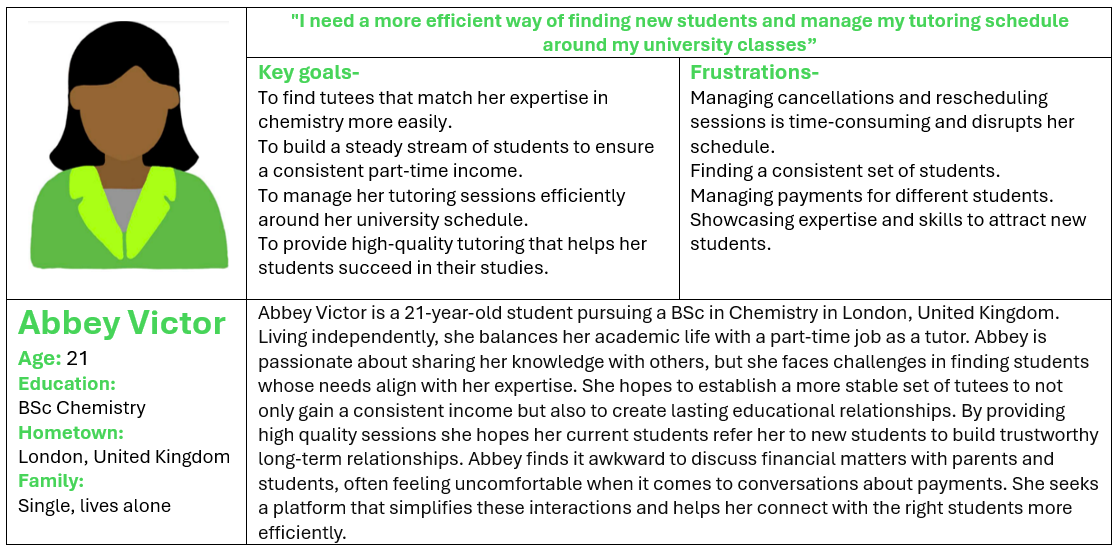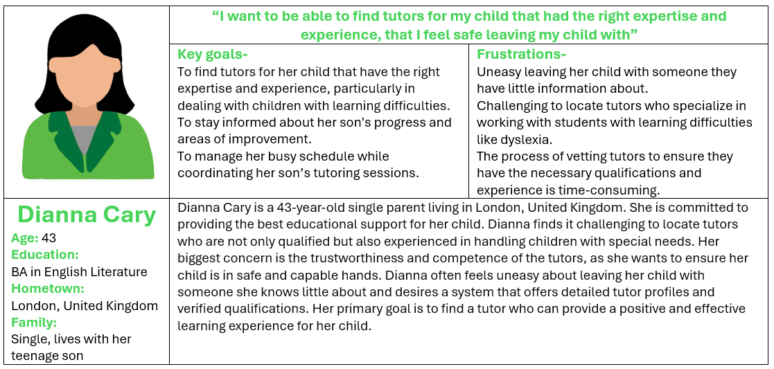 I established user personas so that I can keep my users front and centre throughout the design process without needing to recall every detail from our interviews. These personas also make it easier to explain my design choices. Instead of describing users in vague terms, I can use these personas to tell compelling stories that bring my designs to life and show how they fit into the users' real-world contexts.